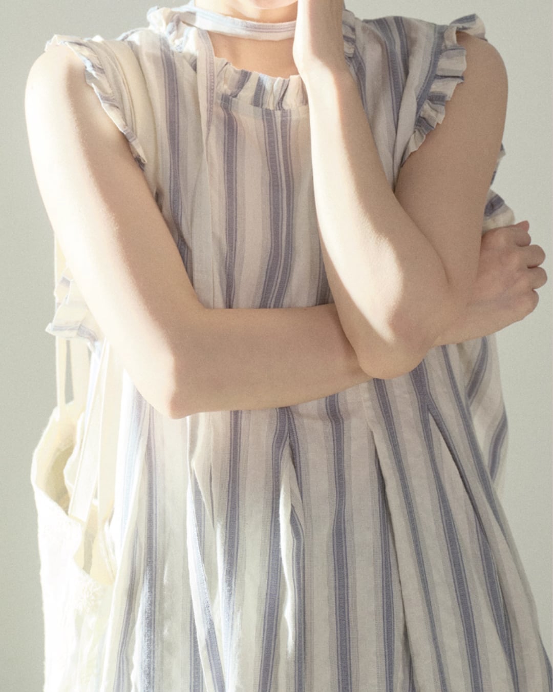 レトロなストライプデザインがかわいいワンピース。袖口のフリルも控えめで可愛すぎずに着ることができます!