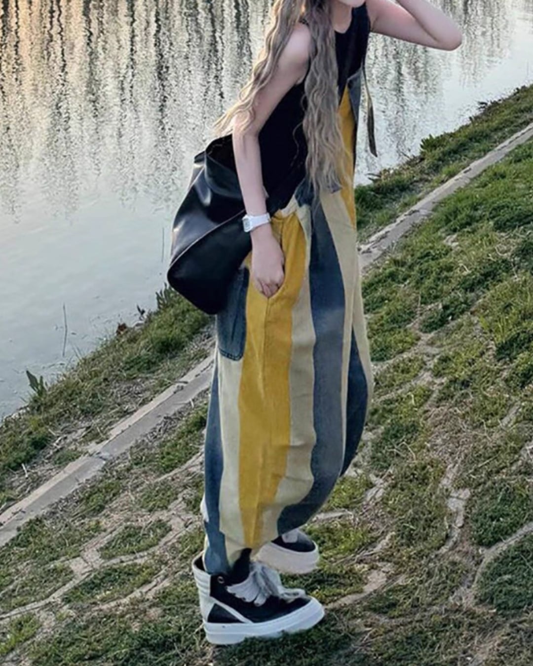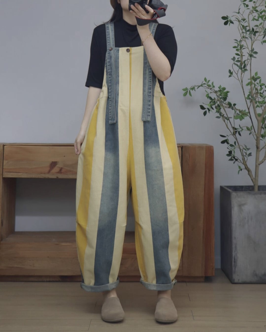 トレンド感満載のデザインが魅力のサロペット。大胆なストライプが全体を引き立て、カジュアルながらも個性的なスタイルを演出します。