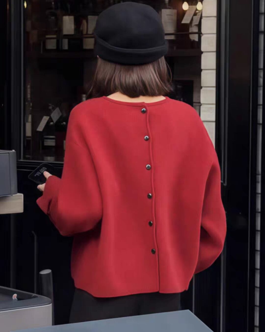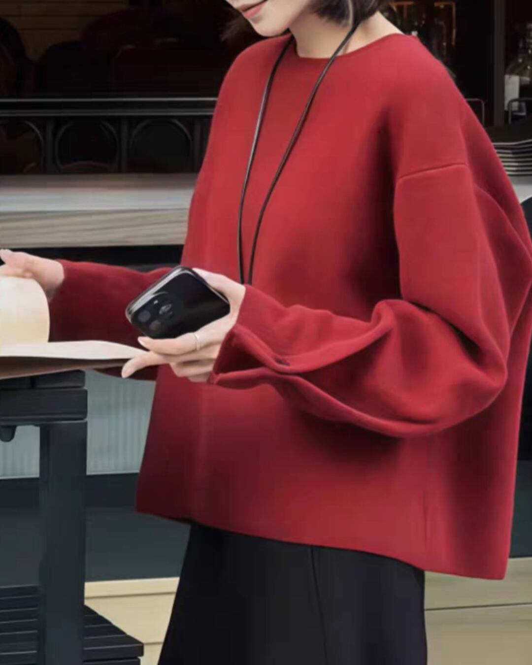 袖口にさりげないデザインが施されたショート丈ニットプルオーバーは、シンプルながらも着る人の魅力を引き立てるアイテムです。
